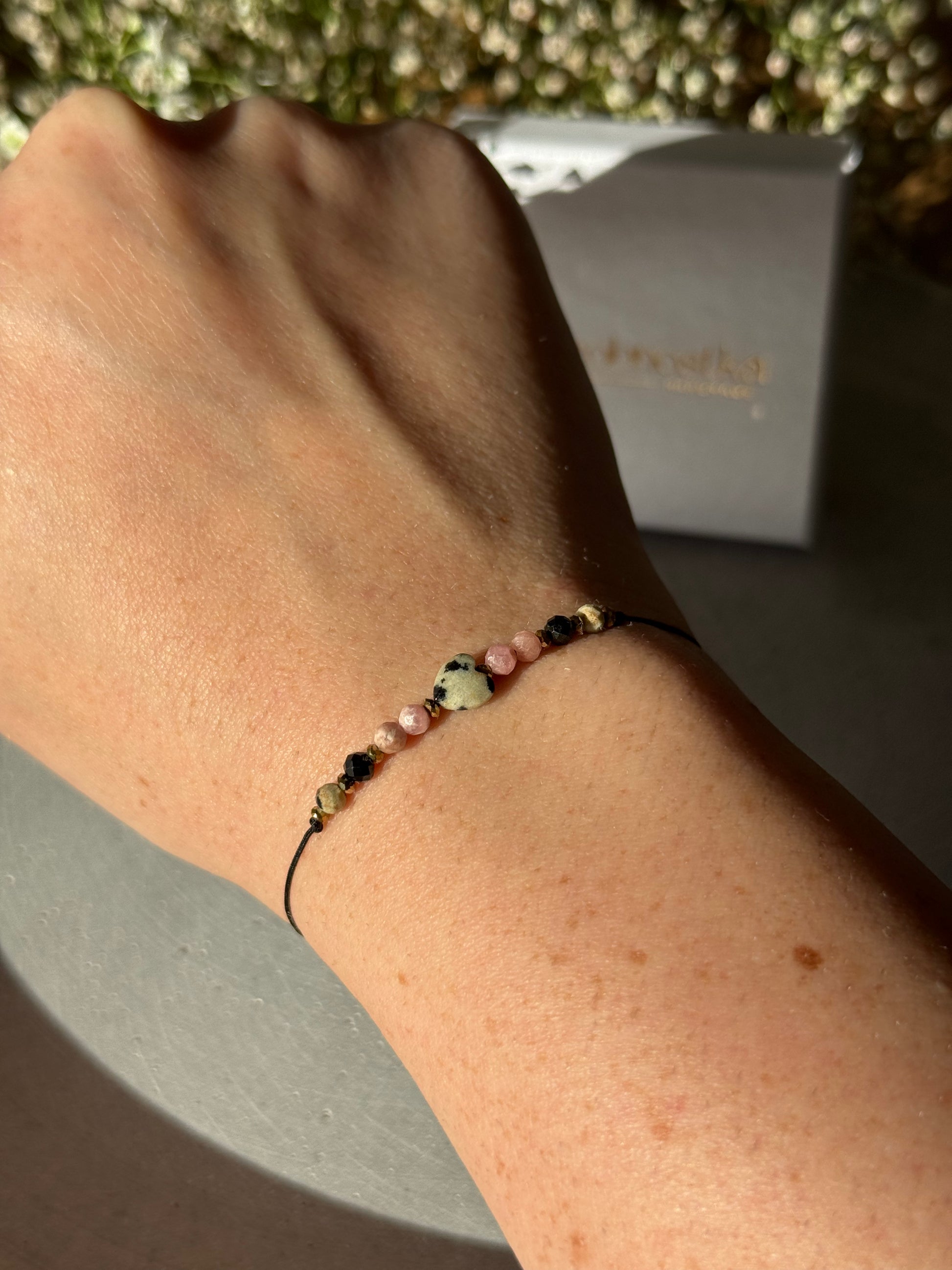„Dalmy” to bransoletka symbolizująca radość życia, wiarę w siebie i moc serca. W centrum znajduje się serce z jaspisu dalmatyńskiego- kamienia optymizmu, który pomaga dostrzegać piękno w codzienności i chroni przed negatywną energią. Towarzyszy mu rodochrozyt, kamień miłości własnej i harmonii w relacjach, a całość wzmacnia czarny spinel, symbol odwagi i wewnętrznej siły.