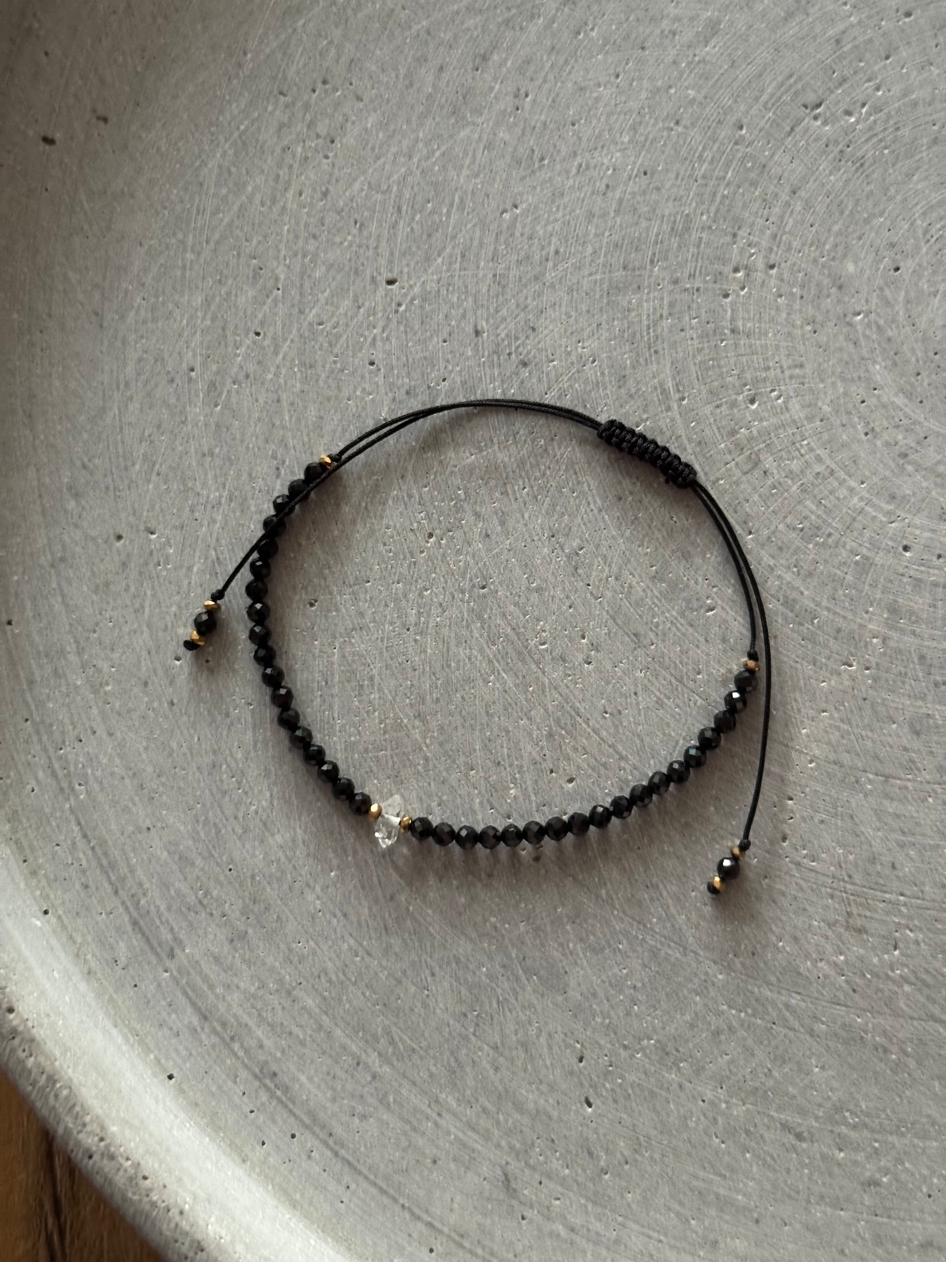 „Clarity” to bransoletka, która łączy subtelność z mocą wewnętrznego światła. W centrum znajduje się maleńki herkimer- kamień czystości i klarowności, symbolizujący wewnętrzną prawdę i duchowe przebudzenie. Otaczają go czarne spinele, znane jako kamienie ochrony i siły, które dodają odwagi i pomagają zachować równowagę w codziennym życiu.