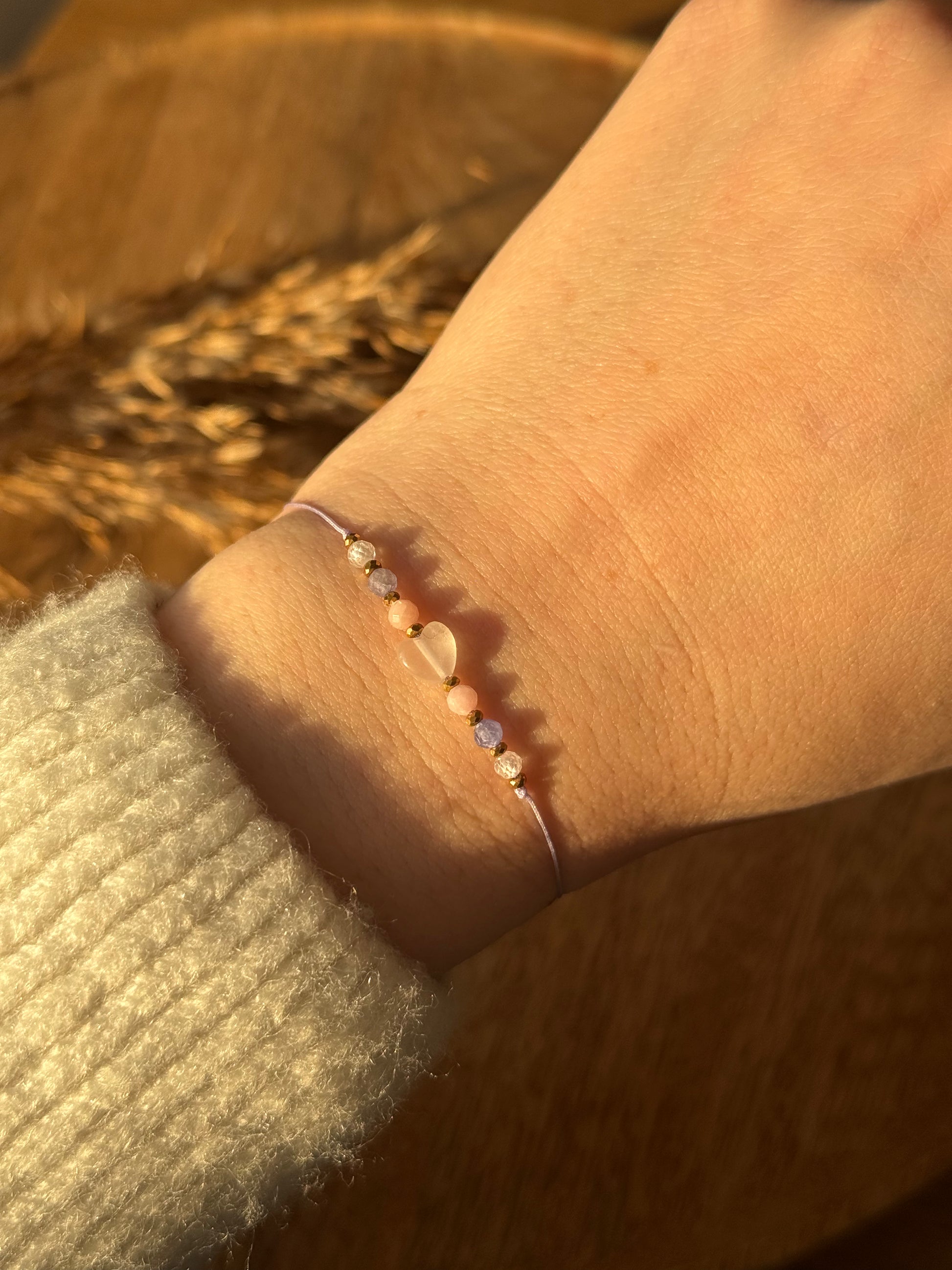 Wyjątkowa, delikatna bransoletka z lepidolitu czerwonego, opalu różowego, tanzanitu i cyrkonii, wykonana na sznurku nylonowym, który zapewnia komfort codziennego noszenia. Bransoletka symbolizuje czułość i delikatność emocji, wspierając spokój, otwartość na miłość i pozytywne wibracje. Lepidolit łagodzi napięcia i stres, opal różowy wzmacnia wrażliwość serca, tanzanit inspiruje do refleksji, a cyrkonia subtelnie rozświetla energię.
